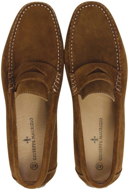 Cognackleurig suède instapschoen met pennyhand en stiksels voor heren van het merk Giuseppe Maurizio.